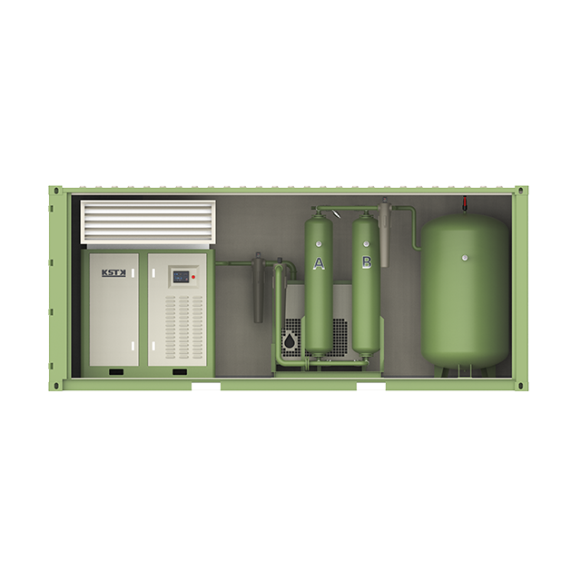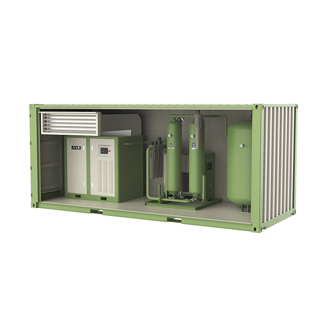 KSTK 集装箱式空气站是一套专为工业空气供应高标准需求而设计的压缩空气制备与净化系统,能够持续输出洁净、高品质的压缩空气。系统核心为高性能空压机,确保压缩空气稳定可靠输出。配合高效的精密净化组件——包括冷冻式干燥机、吸附式干燥机、精密过滤系统、油水分离器等——可有效去除油雾、灰尘及水分,确保压缩空气无油无尘,符合最高纯净度标准。